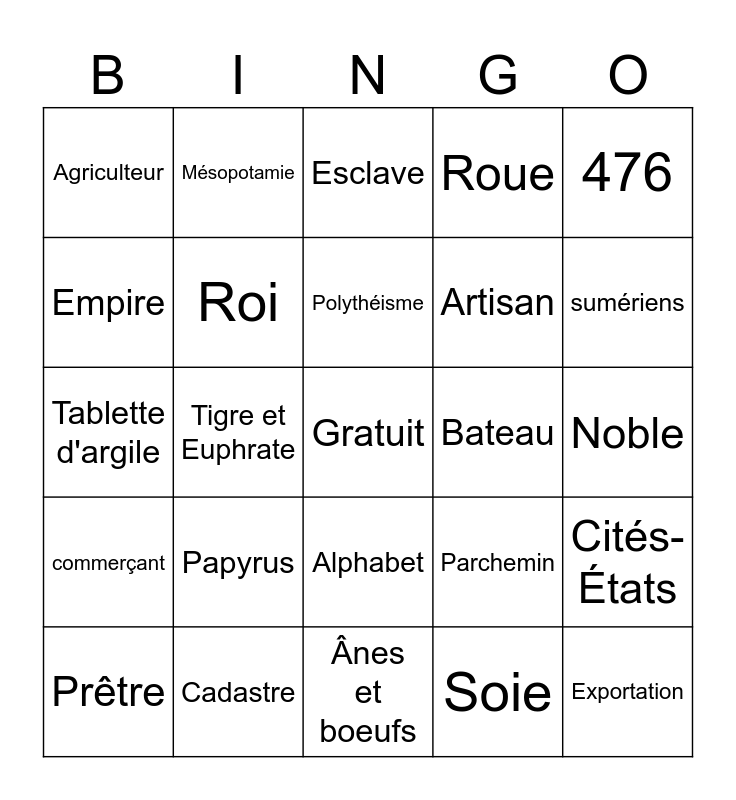 This bingo card has a free space and 54 words: Digue, commerçant, Impôt, Importation, Alphabet, Héréditaire, Roue, Fortifications, Empire, Épopée de Gilgamesh, Agriculteur, Babylone, Cadastre, Prêtre, Charrue, Ânes et boeufs, Exportation, Artisan, Billes d'argile, Noble, Parchemin, Étendard, Bateau, 476, Limon, Mésopotamie, Antiquité, Ishtar, Urbanisation, Soie, Roseau, Écriture cunéiforme, Agriculture, Nabuchodonosor II, Esclave, Sargon, Tablette d'argile, Cités-États, -3300, Roi, Irrigation, Ziggourat, Devin, Civilisation, Papyrus, Plaine, Pictogrammes, Jardins suspendus, Polythéisme, Tigre et Euphrate, sumériens, Code de Hammourabi, Loi du talion and Scribe.