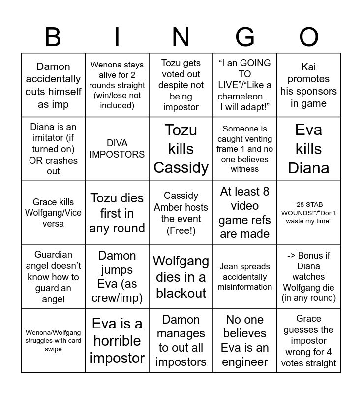 This bingo card has a free space and 24 words: Damon jumps Eva (as crew/imp), Eva is a horrible impostor, Tozu kills Cassidy, Wenona/Wolfgang struggles with card swipe, Kai promotes his sponsors in game, Damon accidentally outs himself as imp, Diana is an imitator (if turned on) OR crashes out, Wenona stays alive for 2 rounds straight (win/lose not included), At least 8 video game refs are made, Wolfgang dies in a blackout, Someone is caught venting frame 1 and no one believes witness, Grace kills Wolfgang/Vice versa, Jean spreads accidentally misinformation, -> Bonus if Diana watches Wolfgang die (in any round), DIVA IMPOSTORS, No one believes Eva is an engineer, “28 STAB WOUNDS!”/“Don’t waste my time”, Tozu gets voted out despite not being impostor, Eva kills Diana, Tozu dies first in any round, Grace guesses the impostor wrong for 4 votes straight, Guardian angel doesn’t know how to guardian angel, “I an GOING TO LIVE”/“Like a chameleon… I will adapt!” and Damon manages to out all impostors.