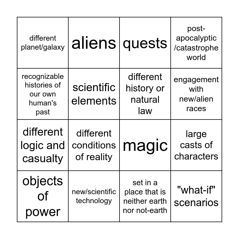 This bingo card has 16 words: new/scientific technology, large casts of characters, quests, different planet/galaxy, different logic and casualty, aliens, magic, set in a place that is neither earth nor not-earth, recognizable histories of our own human's past, scientific elements, objects of power, post-apocalyptic /catastrophe world, different conditions of reality, engagement with new/alien races, different history or natural law and "what-if" scenarios.