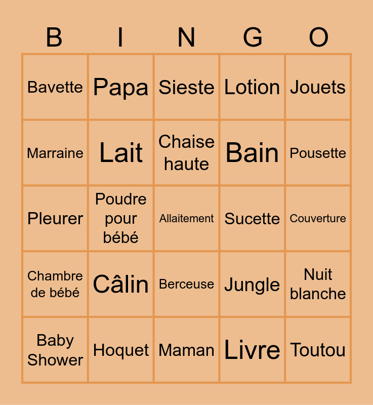 This bingo card has 36 words: Biberon, Siège d'auto, Échographie, Lait, Jungle, Chambre de bébé, Chaise haute, Berceau, Jouets, Hochet, Poudre pour bébé, Lotion, Couche, Sucette, Pousette, Bavette, Toutou, Câlin, Allaitement, Sieste, Couverture, Nuit blanche, Hoquet, Baby Shower, Maman, Papa, Pleurer, Accoucher, Bain, Marraine, Parrain, Onesie, Livre, Berceuse, Première dent and Doudou.
