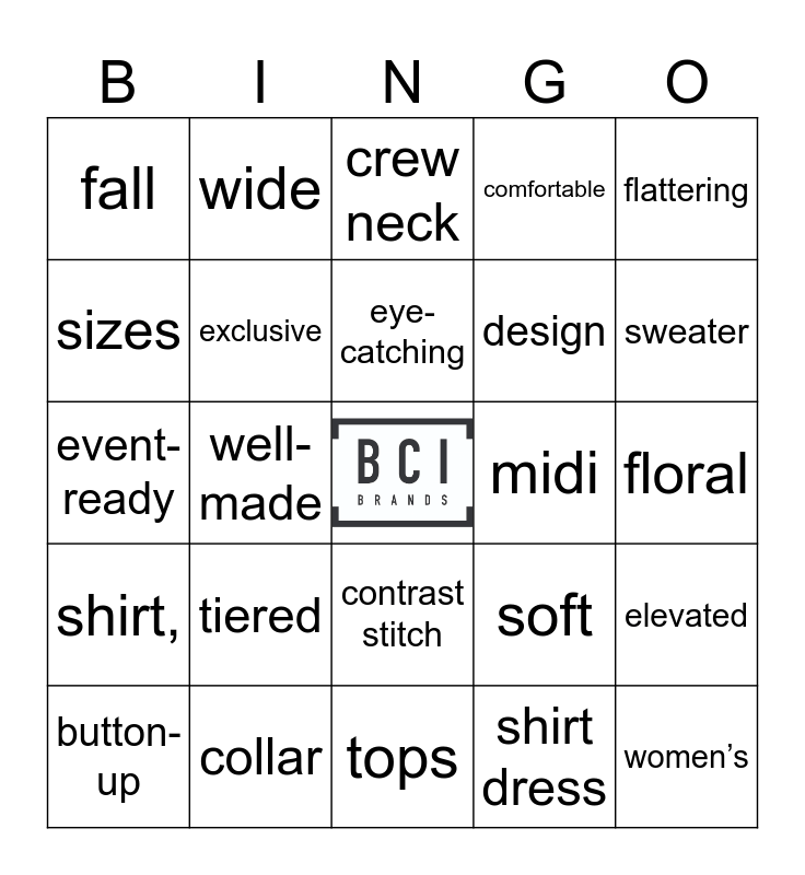This bingo card has a free space and 39 words: dress, spring, silhouette, exclusive, button-up, contrast stitch, eye-catching, metallic, flattering, shirt,, well-made, comfortable, women’s, floral, midi, tiered, skirt, fall, long-sleeve, soft, sizes, tops, design, sweater, cuff, neck, details, pants, straight, wide, sleeve, jumpsuit, crew neck, collar, shirt dress, hem, elevated, event-ready and work.