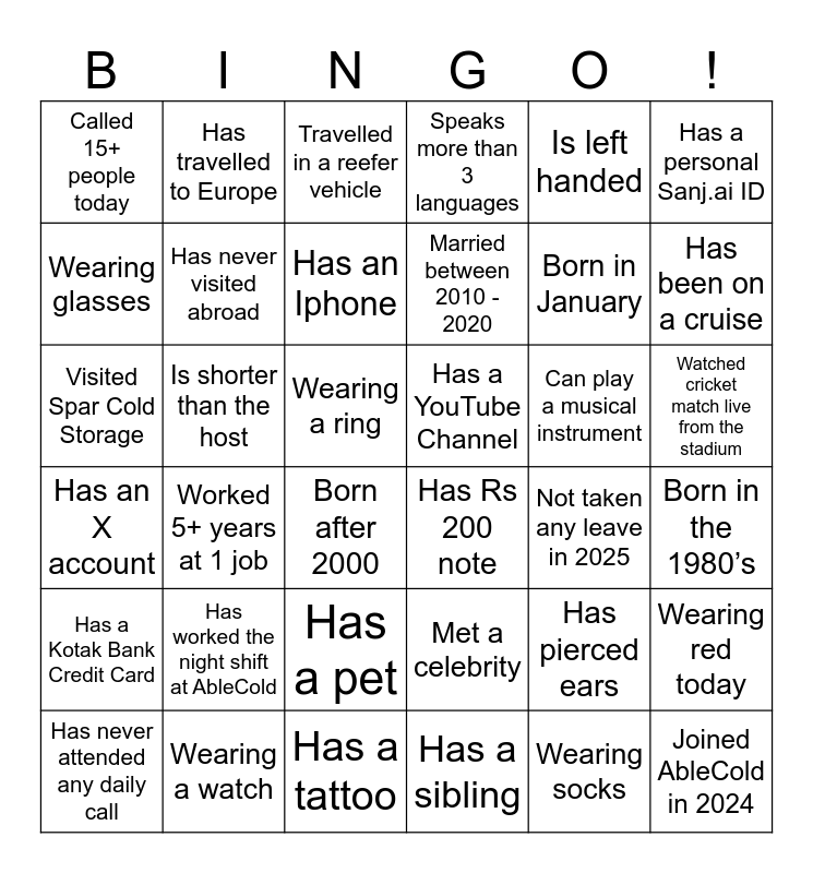 This bingo card has 36 words: Met a celebrity, Has a pet, Has a sibling, Wearing glasses, Has an X account, Has a YouTube Channel, Has never visited abroad, Has a tattoo, Is left handed, Has pierced ears, Has been on a cruise, Speaks more than 3 languages, Wearing red today, Is shorter than the host, Married between 2010 - 2020, Called 15+ people today, Has a Kotak Bank Credit Card, Can play a musical instrument, Visited Spar Cold Storage, Travelled in a reefer vehicle, Wearing a ring, Worked 5+ years at 1 job, Has Rs 200 note, Born after 2000, Not taken any leave in 2025, Has travelled to Europe, Born in January, Wearing a watch, Has an Iphone, Has a personal Sanj.ai ID, Joined AbleCold in 2024, Has never attended any daily call, Born in the 1980’s, Watched cricket match live from the stadium, Has worked the night shift at AbleCold and Wearing socks.