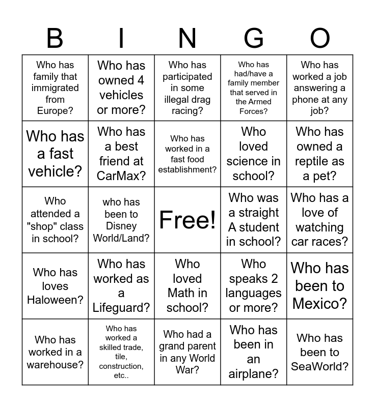 This bingo card has a free space and 24 words: Who has worked as a Lifeguard?, Who has worked a skilled trade, tile, construction, etc.., Who has worked in a fast food establishment?, Who has worked in a warehouse?, Who has worked a job answering a phone at any job?, Who has family that immigrated from Europe?, Who has a fast vehicle?, Who has owned 4 vehicles or more?, Who was a straight A student in school?, Who loved Math in school?, Who loved science in school?, Who attended a "shop" class in school?, Who speaks 2 languages or more?, Who has been to Mexico?, Who has a best friend at CarMax?, Who has been in an airplane?, Who has a love of watching car races?, Who has participated in some illegal drag racing?, Who has owned a reptile as a pet?, who has been to Disney World/Land?, Who has been to SeaWorld?, Who has loves Haloween?, Who has had/have a family member that served in the Armed Forces? and Who had a grand parent in any World War?.