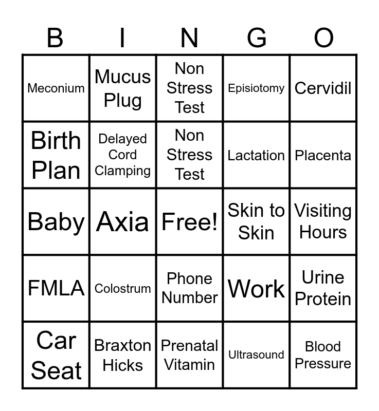 This bingo card has a free space and 39 words: 1 hr Glucola, Birth Control, Apgar Score, Delayed Cord Clamping, Car Seat, Phone Number, Non Stress Test, Nurses Station, Cervidil, FMLA, Axia, Episiotomy, Blood Pressure, Visiting Hours, Skin to Skin, Colostrum, Deb Becker, Meconium, Rhogam, Work, Birth Plan, Prenatal Vitamin, Lactation, Placenta, GBS, Anemia, Midwife, Round Ligament Pain, Vitamin K, Mucus Plug, Visiting Hours, Lactation, Non Stress Test, Braxton Hicks, Ultrasound, Breast Pump, Urine Protein, Baby and Warm Line.