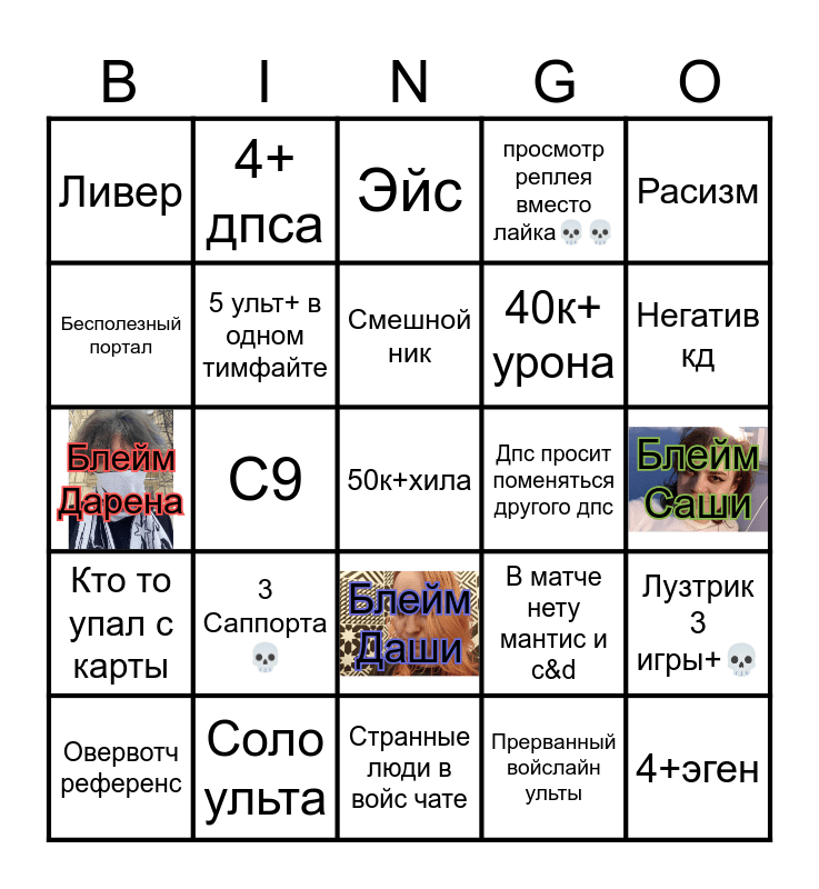 This bingo card has 3 images, a free space and 24 words: 3 Саппорта💀, Соло ульта, Смешной ник, Овервотч референс, Расизм, Ливер, Бесполезный портал, 4+ дпса, Дпс просит поменяться другого дпс, Блейм Даши, 40к+ урона, Блейм Дарена, В матче нету мантис и c&d, Лузтрик 3 игры+💀, 5 ульт+ в одном тимфайте, Прерванный войслайн ульты, Блейм Саши, Эйс, Негатив кд, С9, 4+эген, Кто то упал с карты, просмотр реплея вместо лайка💀💀 and Странные люди в войс чате.