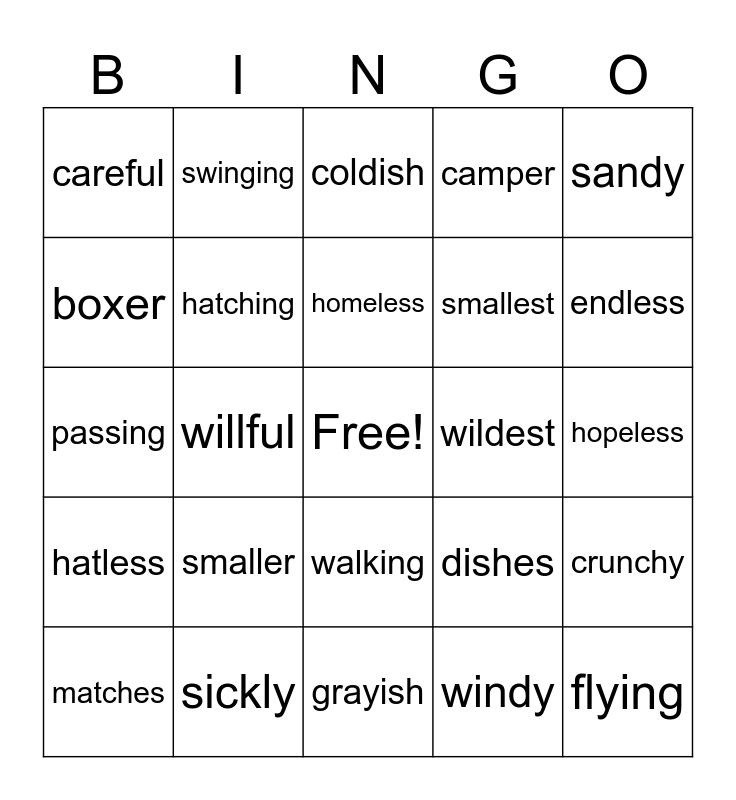 This bingo card has a free space and 34 words: Helpless, windy, wishful, kindness, hatless, hatching, sandy, matches, swinging, faster, homeless, coldish, boxes, singer, wildest, endless, sickly, passing, smaller, dishes, walking, longest, careful, hopeless, grayish, flying, camper, endlessly, smallest, boxer, useless, willful, crunchy and inches.