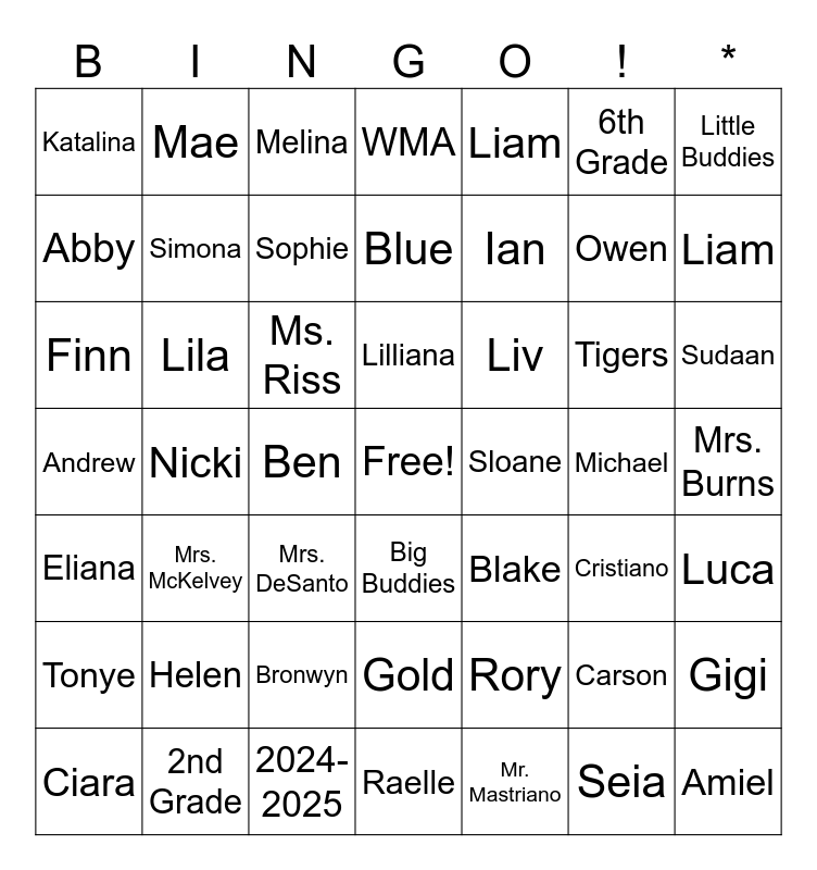 This bingo card has a free space and 48 words: Rory, Owen, Raelle, Nicki, Ms. Riss, Mrs. Burns, Mae, 2nd Grade, 6th Grade, Big Buddies, Little Buddies, WMA, Tigers, Liv, Tonye, Michael, Abby, Liam, Carson, Liam, Ian, Ben, Katalina, Simona, Gigi, Sophie, Sudaan, Ciara, Lilliana, Lila, Seia, Sloane, Luca, Helen, Andrew, Blake, Cristiano, Finn, Mrs. DeSanto, Bronwyn, Eliana, Amiel, Melina, 2024-2025, Blue, Gold, Mrs. McKelvey and Mr. Mastriano.