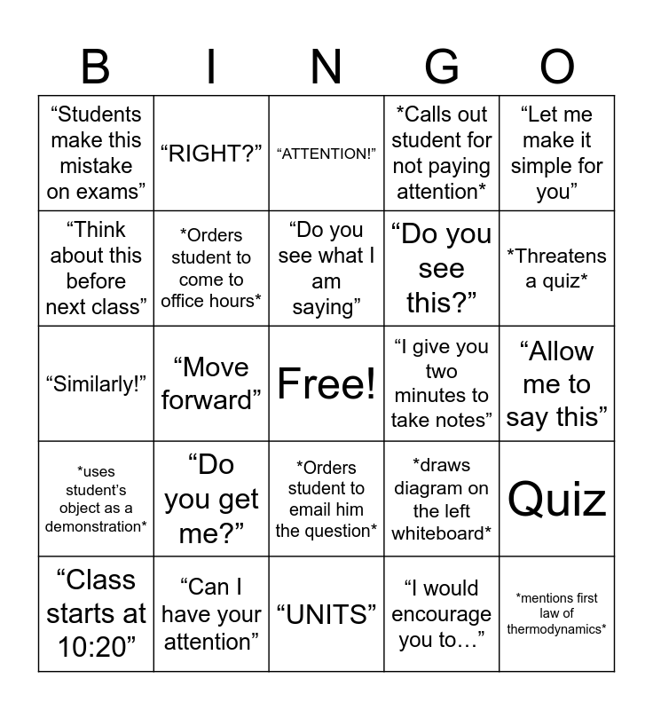 This bingo card has a free space and 30 words: “Can I have your attention”, *dodges a question/let me finish*, “Move forward”, “My dear students”, “Students make this mistake on exams”, “ATTENTION!”, *Orders student to come to office hours*, *Orders student to email him the question*, “I give you two minutes to take notes”, “UNITS”, “Allow me to say this”, *mentions first law of thermodynamics*, “I would encourage you to…”, “Do you agree”, *Threatens a quiz*, “I would like to kindly ask you”, *draws diagram on the left whiteboard*, *uses student’s object as a demonstration*, “Do you get me?”, “Let me make it simple for you”, “Similarly!”, *CLAPS*, “RIGHT?”, “Do you see this?”, “Think about this before next class”, *Calls out student for not paying attention*, Quiz, “Class starts at 10:20”, “Do you see what I am saying” and “No pictures please”.