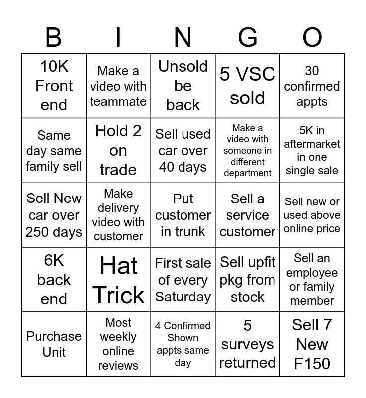 This bingo card has a free space and 24 words: Hat Trick, Most weekly online reviews, Sell used car over 40 days, Purchase Unit, 30 confirmed appts, 10K Front end, Same day same family sell, Make a video with teammate, Sell a service customer, First sale of every Saturday, Make a video with someone in different department, Sell New car over 250 days, Sell upfit pkg from stock, Sell an employee or family member, Hold 2 on trade, 5 surveys returned, Sell new or used above online price, Unsold be back, 5K in aftermarket in one single sale, Make delivery video with customer, Sell 7 New F150, 6K back end, 5 VSC sold and 4 Confirmed Shown appts same day.
