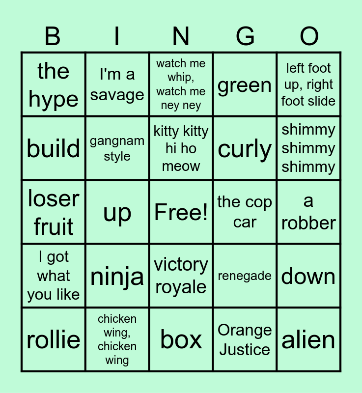 This bingo card has a free space and 34 words: take the L, Orange Justice, say so, kitty kitty, I got what you like, gangnam style, left foot up, right foot slide, rollie, I'm a savage, the flow, the crow, the no, kitty kitty hi ho meow, watch me whip, watch me ney ney, blinding lights, reboot, the cop car, shimmy shimmy shimmy, chicken wing, chicken wing, loser fruit, ninja, renegade, victory royale, got me a million diligently, the hype, a robber, box, alien, green, orange, curly, build, look, up, down and around.