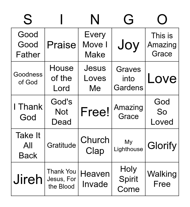 This bingo card has a free space and 24 words: Gratitude, Thank You Jesus, For the Blood, Jesus Loves Me, Jireh, This is Amazing Grace, Good Good Father, Goodness of God, Praise, Amazing Grace, Church Clap, Graves into Gardens, I Thank God, My Lighthouse, Glorify, House of the Lord, Holy Spirit Come, God So Loved, Every Move I Make, Love, God's Not Dead, Walking Free, Take It All Back, Joy and Heaven Invade.