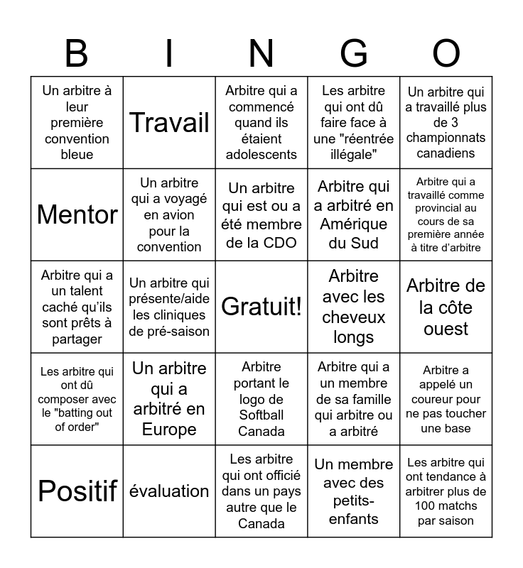 This bingo card has a free space and 24 words: Un arbitre qui a arbitré en Europe, évaluation, Un arbitre qui est ou a été membre de la CDO, Positif, Un arbitre qui a travaillé plus de 3 championnats canadiens, Un arbitre à leur première convention bleue, Mentor, Travail, Arbitre avec les cheveux longs, Arbitre portant le logo de Softball Canada, Arbitre qui a arbitré en Amérique du Sud, Arbitre qui a un talent caché qu’ils sont prêts à partager, Arbitre qui a un membre de sa famille qui arbitre ou a arbitré, Arbitre a appelé un coureur pour ne pas toucher une base, Un arbitre qui a voyagé en avion pour la convention, Un membre avec des petits-enfants, Arbitre de la côte ouest, Arbitre qui a commencé quand ils étaient adolescents, Arbitre qui a travaillé comme provincial au cours de sa première année à titre d’arbitre, Un arbitre qui présente/aide les cliniques de pré-saison, Les arbitre qui ont tendance à arbitrer plus de 100 matchs par saison, Les arbitre qui ont dû composer avec le "batting out of order", Les arbitre qui ont dû faire face à une "réentrée illégale" and Les arbitre qui ont officié dans un pays autre que le Canada.