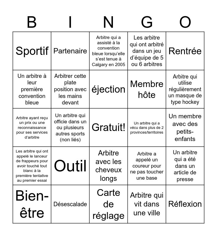This bingo card has a free space and 24 words: Outil, Désescalade, éjection, Bien-être, Rentrée, Sportif, Un arbitre à leur première convention bleue, Partenaire, Un arbitre qui a vécu dans plus de 2 provinces/territoires, Arbitre avec les cheveux longs, Membre hôte, Arbitre ayant reçu un prix ou une reconnaissance pour ses services d’arbitre, Arbitre a appelé un coureur pour ne pas toucher une base, Un arbitre qui a été dans un article de presse, Arbitrer cette plate position avec les mains devant, Arbitre qui vit dans une ville, Un membre avec des petits-enfants, Arbitre qui a assisté à la convention bleue lorsqu’elle s’est tenue à Calgary en 2005, Arbitre qui utilise régulièrement un masque de type hockey, Un arbitre qui officie dans un ou plusieurs autres sports (non liés), Réflexion, Les arbitre qui ont appelé le lanceur de frappeurs pour avoir touché tout blanc à la première tentative au premier essai, Les arbitre qui ont arbitré dans un jeu d’équipe de 5 ou 6 arbitres and Carte de réglage.
