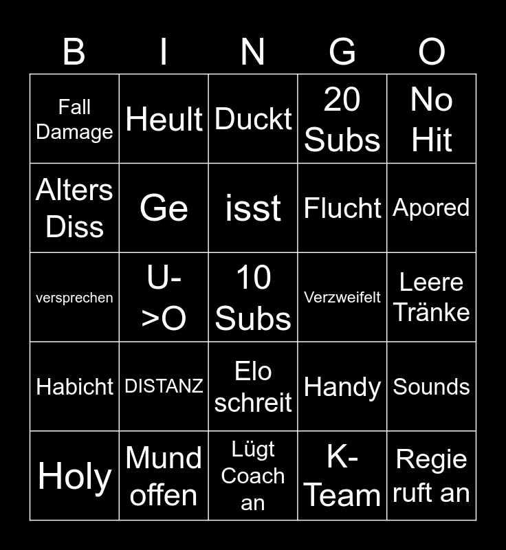 This bingo card has a free space and 24 words: DISTANZ, Mund offen, isst, Holy, No Hit, Fall Damage, Alters Diss, Heult, Verzweifelt, Elo schreit, Flucht, versprechen, Handy, Sounds, Ge, K-Team, Leere Tränke, Duckt, Apored, U->O, Regie ruft an, Habicht, 20 Subs and Lügt Coach an.