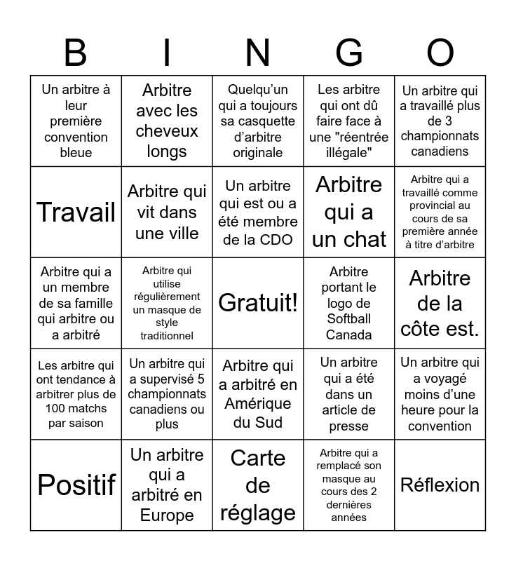 This bingo card has a free space and 24 words: Un arbitre qui a supervisé 5 championnats canadiens ou plus, Un arbitre qui a arbitré en Europe, Un arbitre qui est ou a été membre de la CDO, Positif, Un arbitre qui a travaillé plus de 3 championnats canadiens, Un arbitre à leur première convention bleue, Travail, Arbitre avec les cheveux longs, Arbitre portant le logo de Softball Canada, Arbitre qui a arbitré en Amérique du Sud, Arbitre qui a un chat, Arbitre qui a un membre de sa famille qui arbitre ou a arbitré, Un arbitre qui a été dans un article de presse, Un arbitre qui a voyagé moins d’une heure pour la convention, Arbitre qui vit dans une ville, Arbitre qui a remplacé son masque au cours des 2 dernières années, Arbitre de la côte est., Quelqu’un qui a toujours sa casquette d’arbitre originale, Arbitre qui a travaillé comme provincial au cours de sa première année à titre d’arbitre, Arbitre qui utilise régulièrement un masque de style traditionnel, Réflexion, Les arbitre qui ont tendance à arbitrer plus de 100 matchs par saison, Les arbitre qui ont dû faire face à une "réentrée illégale" and Carte de réglage.