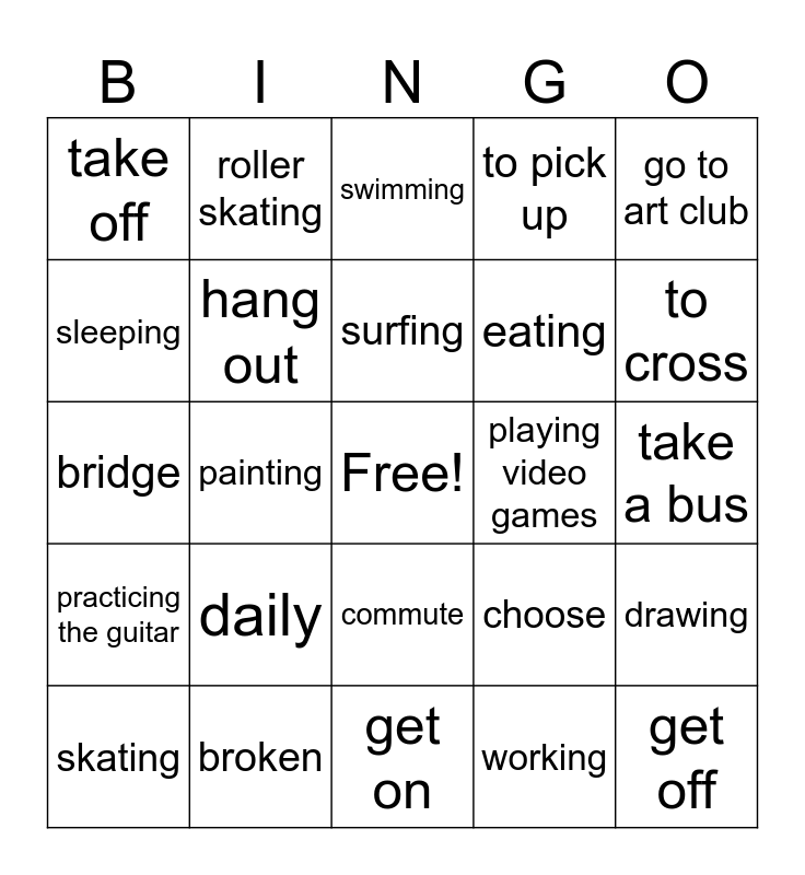 This bingo card has a free space and 34 words: cooking, working, work out, studying, practicing the guitar, hang out, go to art club, skating, roller skating, ice skating, surfing, swimming, baking, playing a sport, playing video games, to cross, broken, bridge, daily, choose, commute, ride, take off, take a bus, get on, get off, to pick up, cleaning, eating, sleeping, reading, painting, drawing and singing.