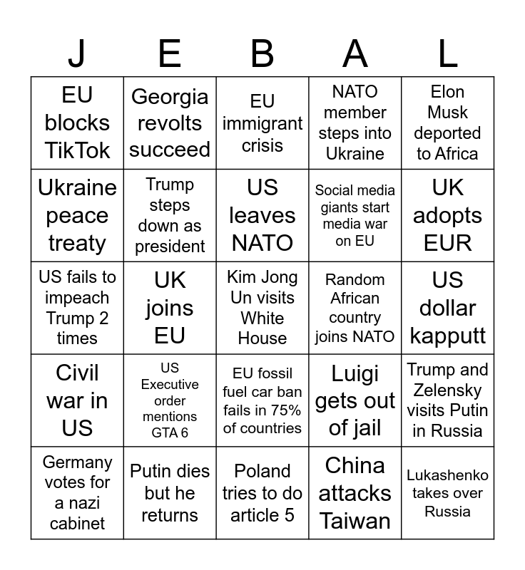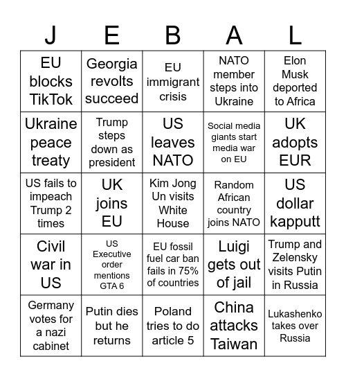 This bingo card has a free space and 24 words: US Executive order mentions GTA 6, Putin dies but he returns, US leaves NATO, Germany votes for a nazi cabinet, Elon Musk deported to Africa, EU blocks TikTok, Ukraine peace treaty, Georgia revolts succeed, Random African country joins NATO, EU fossil fuel car ban fails in 75% of countries, Social media giants start media war on EU, US fails to impeach Trump 2 times, Luigi gets out of jail, Trump and Zelensky visits Putin in Russia, Trump steps down as president, China attacks Taiwan, US dollar kapputt, EU immigrant crisis, UK adopts EUR, UK joins EU, Lukashenko takes over Russia, Civil war in US, NATO member steps into Ukraine and Poland tries to do article 5.