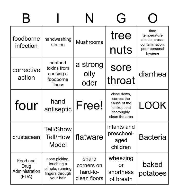 This bingo card has a free space and 24 words: Tell/Show Tell/How Model, nose picking, touching a pimple, running fingers through your hair, a strong oily odor, Food and Drug Administration (FDA), time temperature abuse, cross-contamination, poor personal hygiene, foodborne infection, corrective action, handwashing station, close down, correct the cause of the backup and thoroughly clean the area, flatware, sore throat, four, infants and preschool-aged children, Bacteria, seafood toxins from causing a foodborne illness, wheezing or shortness of breath, LOOK, Mushrooms, diarrhea, hand antiseptic, baked potatoes, crustacean, tree nuts and sharp corners on hard-to-clean floors.