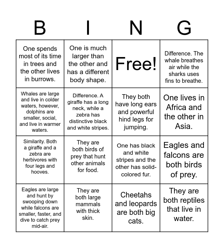 This bingo card has 27 words: Both a bat and a bird are capable of flight. Is this a similarity or a difference?, A koala and a wombat are both marsupials from Australia., Similarity. Both a giraffe and a zebra are herbivores with four legs and hooves., One is a mammal and the other is an avian species., Difference. A giraffe has a long neck, while a zebra has distinctive black and white stripes., Free!, One is much larger than the other and has a different body shape., They are both reptiles that live in water., They are both large mammals with thick skin., One prefers saltwater and the other prefers freshwater., One has black and white stripes and the other has solid-colored fur., Difference. The whale breathes air while the sharks uses fins to breathe., Both a whale and a dolphin live in the ocean and breathe air., One is known for its incredible speed and the other for its strength and climbing ability., They are both birds of prey that hunt other animals for food., One has tusks and the other has a horn., They both have long ears and powerful hind legs for jumping., One lives in Africa and the other in Asia., Difference. The rabbit and hare live in different places., One spends most of its time in trees and the other lives in burrows., Cheetahs and leopards are both big cats., Cheetahs are the fastest land animals and built for speed but leopards are stronger, more muscular, and can climb trees to carry prey., Eagles and falcons are both birds of prey., Eagles are large and hunt by swooping down while falcons are smaller, faster, and dive to catch prey mid-air., They are both mammals that live in the ocean., Whales are large and live in colder waters, however, dolphins are smaller, social, and live in warmer waters. and Bees and butterflies are both insects that help pollinate flowers..