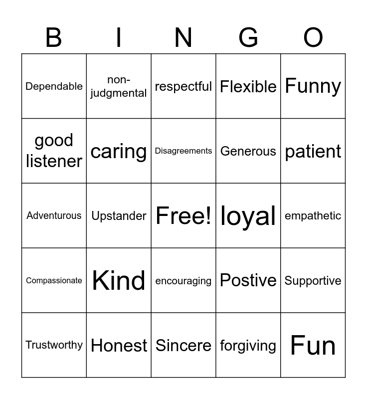 This bingo card has a free space and 24 words: Kind, Honest, Disagreements, Trustworthy, Funny, Dependable, good listener, non-judgmental, loyal, encouraging, Generous, Adventurous, Postive, Supportive, caring, forgiving, empathetic, respectful, patient, Upstander, Fun, Compassionate, Flexible and Sincere.