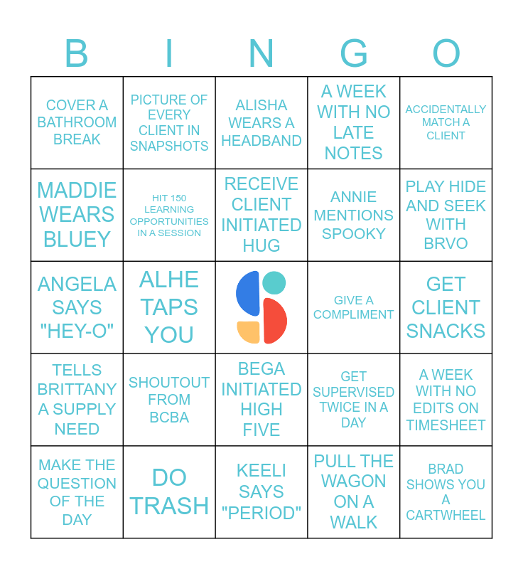 This bingo card has a free space and 24 words: SHOUTOUT FROM BCBA, DO TRASH, RECEIVE CLIENT INITIATED HUG, MAKE THE QUESTION OF THE DAY, ACCIDENTALLY MATCH A CLIENT, COVER A BATHROOM BREAK, MADDIE WEARS BLUEY, PICTURE OF EVERY CLIENT IN SNAPSHOTS, GIVE A COMPLIMENT, BEGA INITIATED HIGH FIVE, ANNIE MENTIONS SPOOKY, ANGELA SAYS "HEY-O", GET SUPERVISED TWICE IN A DAY, A WEEK WITH NO EDITS ON TIMESHEET, HIT 150 LEARNING OPPORTUNITIES IN A SESSION, PULL THE WAGON ON A WALK, GET CLIENT SNACKS, ALISHA WEARS A HEADBAND, PLAY HIDE AND SEEK WITH BRVO, ALHE TAPS YOU, BRAD SHOWS YOU A CARTWHEEL, TELLS BRITTANY A SUPPLY NEED, A WEEK WITH NO LATE NOTES and KEELI SAYS "PERIOD".