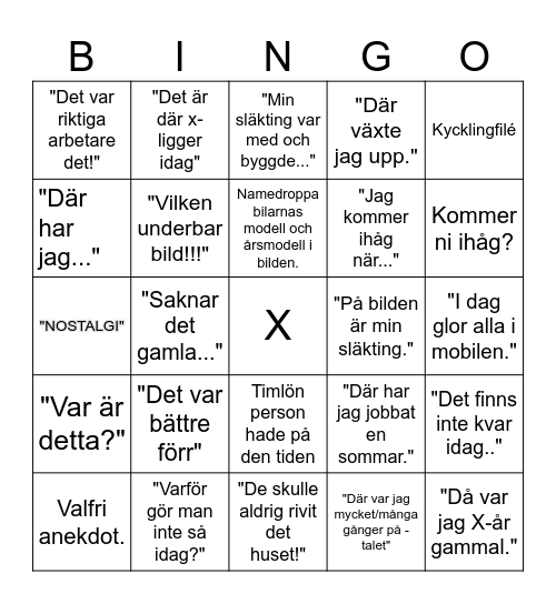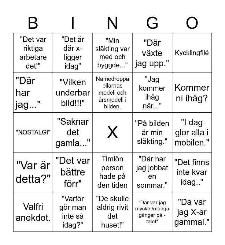 This bingo card has a free space and 24 words: "Det var bättre förr", "Varför gör man inte så idag?", Namedroppa bilarnas modell och årsmodell i bilden., Valfri anekdot., Kycklingfilé, "Det var riktiga arbetare det!", "Där har jag...", "Det är där x-ligger idag", "På bilden är min släkting.", Timlön person hade på den tiden, "Jag kommer ihåg när...", "NOSTALGI", "Där har jag jobbat en sommar.", "Det finns inte kvar idag..", "Vilken underbar bild!!!", "Där var jag mycket/många gånger på -talet", "I dag glor alla i mobilen.", "Min släkting var med och byggde...", Kommer ni ihåg?, "Saknar det gamla...", "Då var jag X-år gammal.", "Var är detta?", "Där växte jag upp." and "De skulle aldrig rivit det huset!".