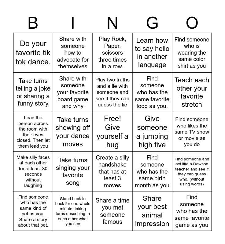 This bingo card has a free space and 29 words: Find someone who has the same kind of pet as you. Share a story about that pet., Find someone who has read the same novel as you., Take turns showing off your dance moves, Find someone who has the same favorite color as you., Do your favorite tik tok dance., Play Rock, Paper, scissors three times in a row., Share with someone your favorite board game and why, Take turns singing your favorite song, Give someone a jumping high five, Stand back to back for one whole minute, taking turns describing to each other what you see, Find someone who likes the same TV show or movie as you do, Find someone who has the same favorite game as you, Share a time you met someone famous, Share your best animal impression, Teach each other your favorite stretch, Play concentration with someone, Create a silly handshake that has at least 3 moves, Make silly faces at each other for at least 30 seconds without laughing, Find someone who is wearing the same color shirt as you, Lead the person across the room with their eyes closed. Then let them lead you, Find someone who has the same birth month as you, Find someone and tell them an embarrassing story, Find someone who has the same favorite food as you., Take turns telling a joke or sharing a funny story, Learn how to say hello in another language, Share with someone how to advocate for themselves, Find someone and act like a Dawson teacher and see if they can guess who. (without using words), Play two truths and a lie with someone and see if they can guess the lie and Find someone who shares the same favorite hobby as you.