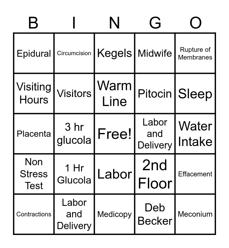This bingo card has a free space and 39 words: Vaginal Delivery, Placenta, Vitamin K, Visitors, Contractions, Labor, Warm Line, Birth Control, Rupture of Membranes, Non Stress Test, 3 hr glucola, Midwife, Meconium, Water Intake, Labor and Delivery, 1 Hr Glucola, FMLA, Epidural, Induction, 2nd Floor, Visiting Hours, Medicopy, Pitocin, Sleep, C-Section, TDap, Locked Unit, Pre-Eclampsia, Delayed Cord Clamping, Circumcision, Phoenixville Hospital, Axia, Kegels, Labor and Delivery, Deb Becker, Meconium, Effacement, Placenta and Vitamin K.