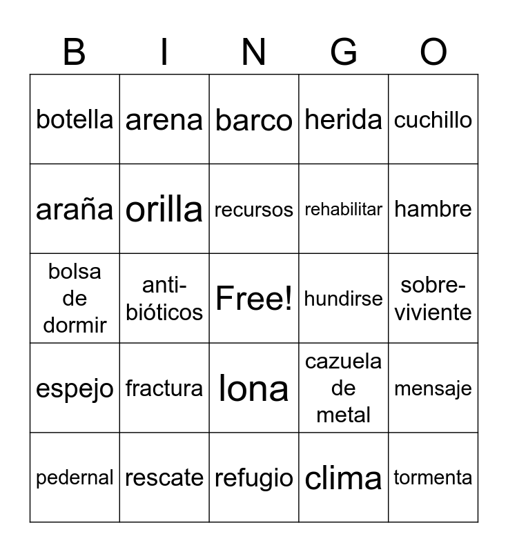 This bingo card has a free space and 29 words: pedernal, cuerda, anti-bióticos, madera, botella, barco, orilla, fractura, hundirse, rescate, sobre-viviente, tormenta, refugio, clima, hambre, sed, lona, espejo, cuchillo, bolsa de dormir, cazuela de metal, sanar, rehabilitar, araña, herida, arena, mensaje, recursos and señal.