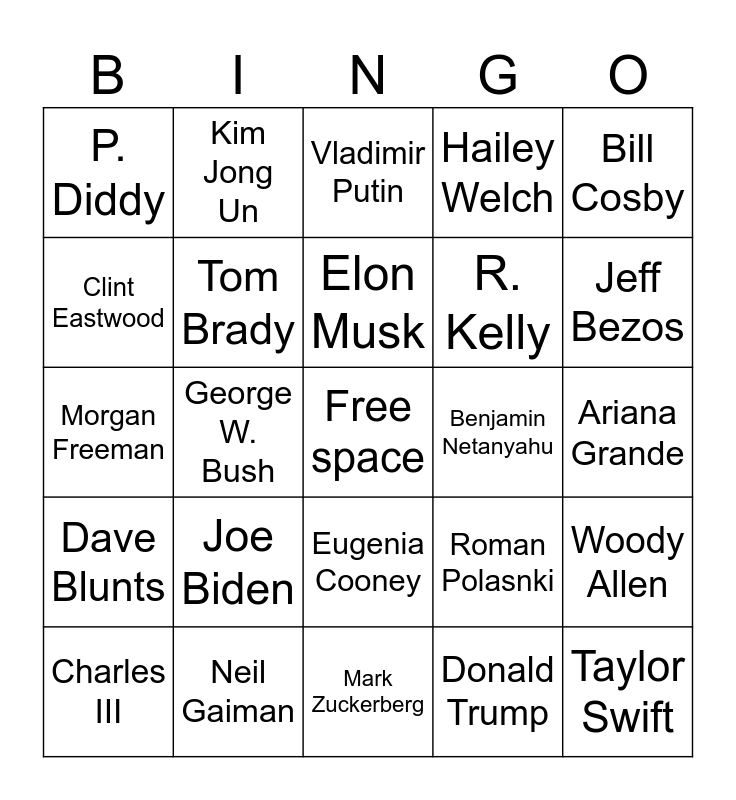 This bingo card has a free space and 24 words: Charles III, Joe Biden, Elon Musk, Donald Trump, Bill Cosby, P. Diddy, Kim Jong Un, Vladimir Putin, Benjamin Netanyahu, Ariana Grande, Morgan Freeman, Tom Brady, Roman Polasnki, Woody Allen, Clint Eastwood, Neil Gaiman, Mark Zuckerberg, Hailey Welch, Jeff Bezos, Dave Blunts, George W. Bush, Eugenia Cooney, R. Kelly and Taylor Swift.
