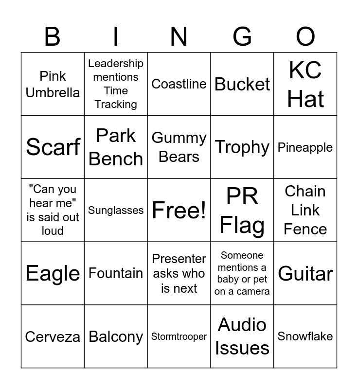 This bingo card has a free space and 38 words: Beans, Confetti, Tiny football, Park Bench, Guitar, Fountain, Gummy Bears, Clipboard, KC Hat, Trophy, Sunglasses, Bucket, Snowflake, Chain Link Fence, Scarf, Eagle, Red door, Coastline, Gazebo, PR Flag, Pink Umbrella, Balcony, Pineapple, Cerveza, Pools, Stormtrooper, Law Enforcement Badge, Instagram Logo, Cowboy Hat, Ketchup, Courtney asks Brian if he wants to present first, Presenter asks who is next, Audio Issues, Leadership mentions Time Tracking, Someone's pet makes a noise in the background, Someone mentions a baby or pet on a camera, "Can you hear me" is said out loud and Someone walks in front of the meeting room camera.