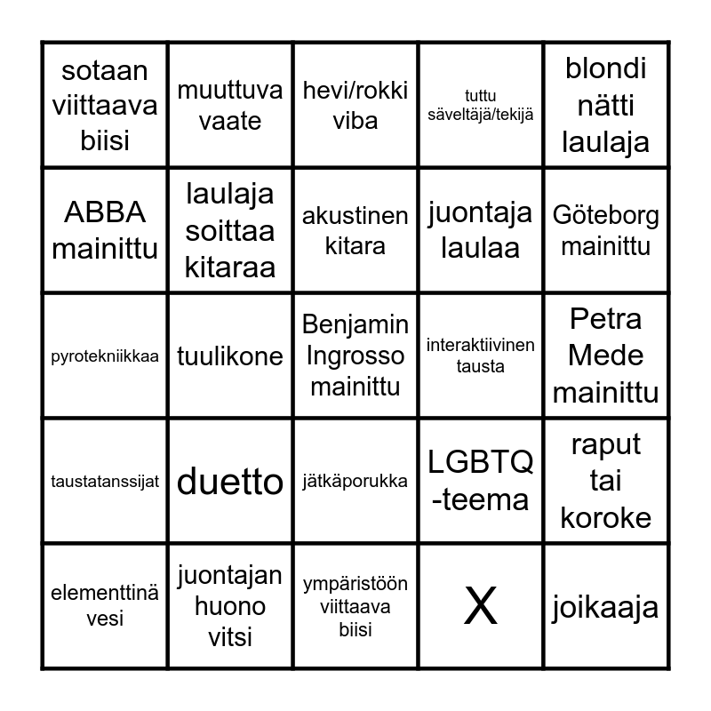 This bingo card has 32 words: X, sieluun kurkotus, tuulikone, lattari biisi, taustatanssijat, laulaja soittaa kitaraa, blondi nätti laulaja, raput tai koroke, muuttuva vaate, joikaaja, akustinen kitara, hevi/rokki viba, bling bling, ledit vaatteissa, interaktiivinen tausta, liikkuvat seinät, elementtinä vesi, pyrotekniikkaa, jätkäporukka, duetto, LGBTQ -teema, mellokonkari, Petra Mede mainittu, juontajan huono vitsi, Benjamin Ingrosso mainittu, tuttu säveltäjä/tekijä, juontaja laulaa, ABBA mainittu, sotaan viittaava biisi, ympäristöön viittaava biisi, lähtölaskenta and Göteborg mainittu.