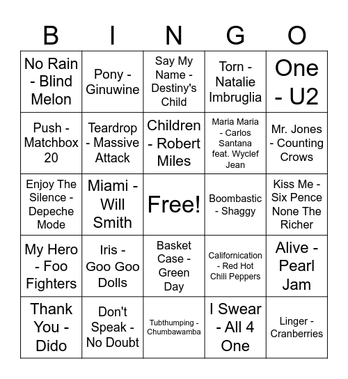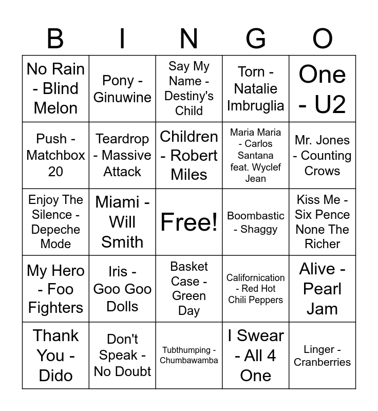 This bingo card has a free space and 49 words: Always - Jon Bon Jovi, Linger - Cranberries, Butterfly - Crazy Town, Tubthumping - Chumbawamba, Iris - Goo Goo Dolls, Slide - Goo Goo Dolls, Pony - Ginuwine, Fantasy - Mariah Carey, Push - Matchbox 20, 3am - Matchbox 20, Teardrop - Massive Attack, Torn - Natalie Imbruglia, Alive - Pearl Jam, Californication - Red Hot Chili Peppers, Otherside - Red Hot Chili Peppers, Angels - Robbie Williams, Children - Robert Miles, Boombastic - Shaggy, Linger - The Cranberries, One - U2, Miami - Will Smith, I Swear - All 4 One, No Rain - Blind Melon, Maria Maria - Carlos Santana feat. Wyclef Jean, Strong Enough - Cher, Mr. Jones - Counting Crows, Thank You - Dido, Ordinary World - Duran Duran, Basket Case - Green Day, My Hero - Foo Fighters, November Rain - Guns And Roses, Fly Away - Lenny Kravitz, Enter Sandman - Metallica, CoCo Jamboo - Mr. President, Don't Speak - No Doubt, Even Flow - Pearl Jam, Scar Tissue - Red Hot Chili Peppers, Everybody Hurts - REM, Kiss Me - Six Pence None The Richer, All Star - Smash Mouth, Strong Enough - Sheryl Crow, Two Princes - Spin Doctors, One Headlight - Wallflowers, Bed Of Roses - Bon Jovi, Enjoy The Silence - Depeche Mode, Say My Name - Destiny's Child, Killing Me Softly - Fugees, Learn To Fly - Foo Fighters and All My Life - KC & Jo Jo.
