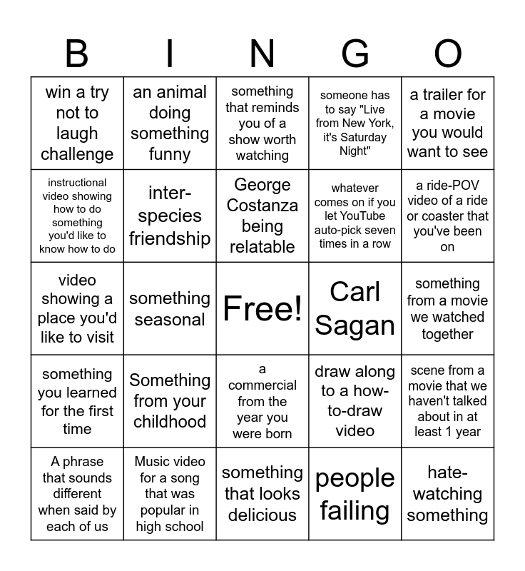 This bingo card has a free space and 24 words: Something from your childhood, Music video for a song that was popular in high school, George Costanza being relatable, A phrase that sounds different when said by each of us, a trailer for a movie you would want to see, win a try not to laugh challenge, instructional video showing how to do something you'd like to know how to do, an animal doing something funny, Carl Sagan, a commercial from the year you were born, whatever comes on if you let YouTube auto-pick seven times in a row, video showing a place you'd like to visit, draw along to a how-to-draw video, scene from a movie that we haven't talked about in at least 1 year, inter-species friendship, people failing, something from a movie we watched together, something that reminds you of a show worth watching, a ride-POV video of a ride or coaster that you've been on, something seasonal, hate-watching something, something you learned for the first time, someone has to say "Live from New York, it's Saturday Night" and something that looks delicious.