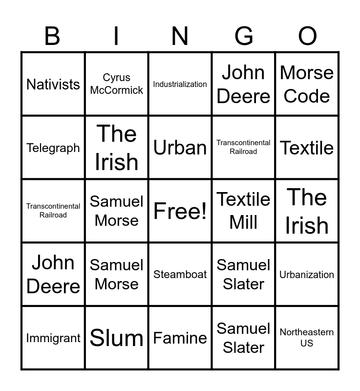 ⚠ This card has duplicate items: Textile (2), Immigrant (2), Chinese (2), Nativists (2), Famine (2), Interchangeable Parts (2), The Irish (2), Telegraph (2), Transcontinental Railroad (2), Erie Canal (2), John Deere (2), Cyrus McCormick (2), Steamboat (2), Bessemer Process (2), Cotton Gin (2), Eli Whitney (2), Morse Code (2), Samuel Morse (2), Slum (2), Northeastern US (2), Textile Mill (2), Factory System (2), Samuel Slater (2), Industrialization (2), Rural (2), Urban (2), Urbanization (2), Manufacture (2)