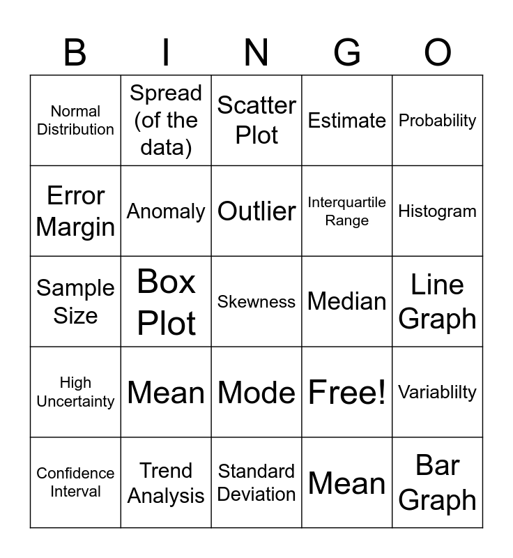 This bingo card has 25 words: Mean, Standard Deviation, Outlier, Confidence Interval, Probability, Normal Distribution, Error Margin, Spread (of the data), Median, Mode, Interquartile Range, Sample Size, Free!, Variablilty, Anomaly, Bar Graph, Line Graph, Scatter Plot, Histogram, Box Plot, Skewness, Trend Analysis, High Uncertainty, Estimate and Mean.