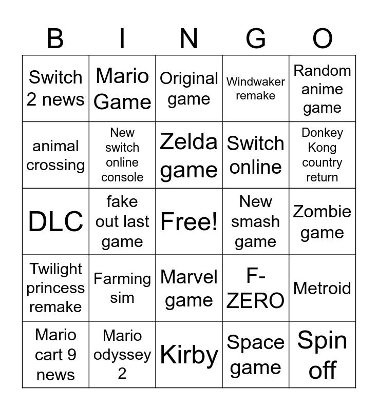 This bingo card has a free space and 24 words: Farming sim, Mario odyssey 2, Zelda game, Mario cart 9 news, Random anime game, Switch 2 news, animal crossing, Mario Game, New smash game, Marvel game, Switch online, DLC, F-ZERO, Metroid, New switch online console, Space game, Zombie game, Original game, Donkey Kong country return, fake out last game, Spin off, Twilight princess remake, Windwaker remake and Kirby.