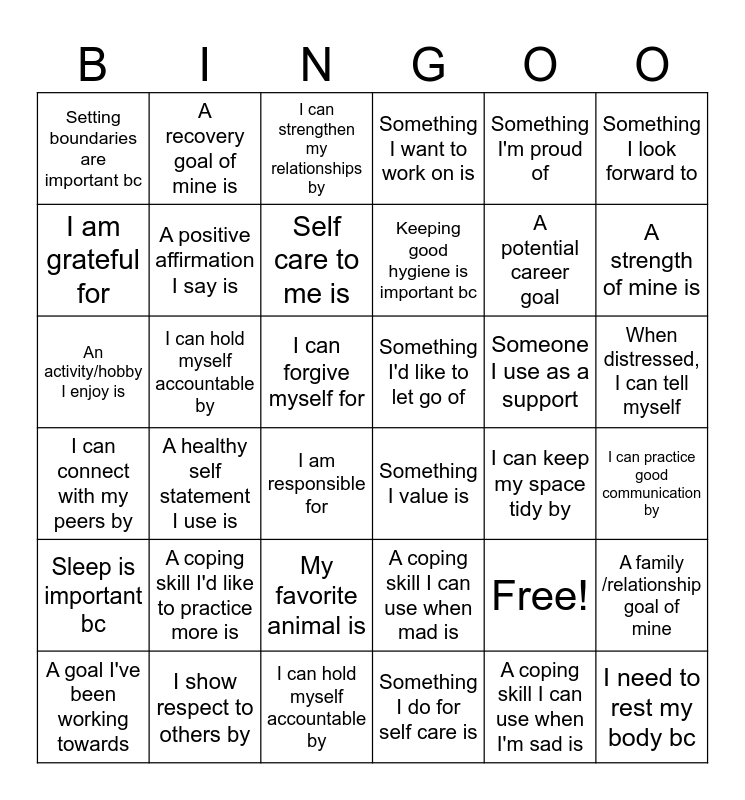 This bingo card has 37 words: Free!, A coping skill I can use when mad is, A coping skill I can use when I'm sad is, I am grateful for, A healthy self statement I use is, Someone I use as a support, A positive affirmation I say is, Something I do for self care is, Something I'm proud of, A goal I've been working towards, A strength of mine is, Something I want to work on is, An activity/hobby I enjoy is, I can forgive myself for, Something I look forward to, Something I'd like to let go of, A coping skill I'd like to practice more is, I can strengthen my relationships by, When distressed, I can tell myself, I can hold myself accountable by, Setting boundaries are important bc, Keeping good hygiene is important bc, I am responsible for, I can keep my space tidy by, I show respect to others by, I can practice good communication by, A recovery goal of mine is, I can hold myself accountable by, A family /relationship goal of mine, My favorite animal is, My favorite artist is, Something I value is, A potential career goal, Sleep is important bc, I can connect with my peers by, Self care to me is and I need to rest my body bc.