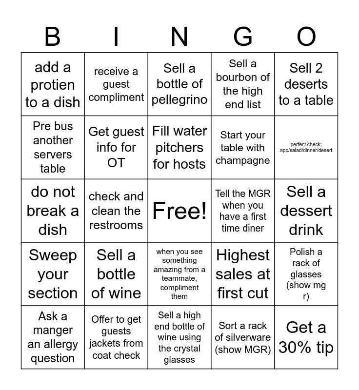 This bingo card has a free space and 24 words: Sell a bottle of wine, Offer to get guests jackets from coat check, Fill water pitchers for hosts, Ask a manger an allergy question, Sell 2 deserts to a table, add a protien to a dish, Pre bus another servers table, receive a guest compliment, Tell the MGR when you have a first time diner, when you see something amazing from a teammate, compliment them, Start your table with champagne, do not break a dish, Highest sales at first cut, Polish a rack of glasses (show mgr), Get guest info for OT, Sort a rack of silverware (show MGR), Sell a dessert drink, Sell a bottle of pellegrino, perfect check; app/salad/dinner/desert, check and clean the restrooms, Get a 30% tip, Sweep your section, Sell a bourbon of the high end list and Sell a high end bottle of wine using the crystal glasses.