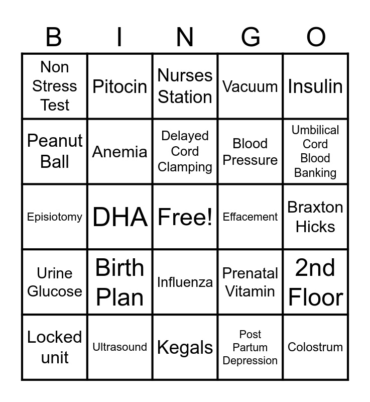This bingo card has a free space and 39 words: Sleep, Circumcision, Penicilin, Anemia, Locked unit, Influenza, Delayed Cord Clamping, GBS, Insulin, Urine Glucose, DHA, Vacuum, Colostrum, Braxton Hicks, Effacement, Birth Plan, TDap, Non Stress Test, Mucus Plug, Prenatal Vitamin, Peanut Ball, Kegals, Blood Pressure, Umbilical Cord Blood Banking, Cervidil, Vaginal Delivery, Visiting Hours, Vitamin K, C-Section, Pitocin, Water Intake, Phoenixville Hospital, Nurses Station, Ultrasound, Post Partum Depression, Lactation, 2nd Floor, Episiotomy and Axia.