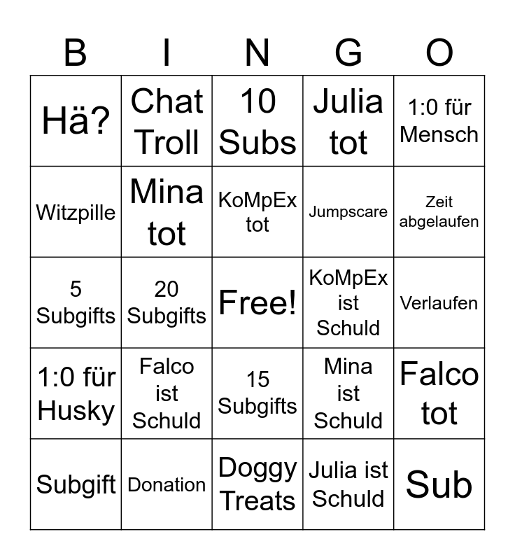 This bingo card has a free space and 24 words: Falco ist Schuld, Donation, KoMpEx tot, Subgift, 1:0 für Mensch, Hä?, Witzpille, Chat Troll, KoMpEx ist Schuld, 15 Subgifts, Jumpscare, 5 Subgifts, Mina ist Schuld, Falco tot, Mina tot, Julia ist Schuld, Verlaufen, 10 Subs, Zeit abgelaufen, 20 Subgifts, Sub, 1:0 für Husky, Julia tot and Doggy Treats.