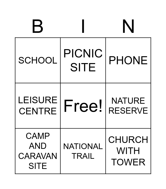 This bingo card has a free space and 20 words: GOLF, CAMPSITE, PHONE, PARKING, MAST, CHURCH WITH TOWER, CHURCH WITH SPIRE, SCHOOL, PLACE OF WORSHIP, PICNIC SITE, TRAIN STATION, WIND PUMP, NATURE RESERVE, CARAAVAN SITE, CAMP AND CARAVAN SITE, VISITOR CENTRE, NATIONAL TRAIL, LEISURE CENTRE, BOAT TRIP and HERITAGE CENTRE.