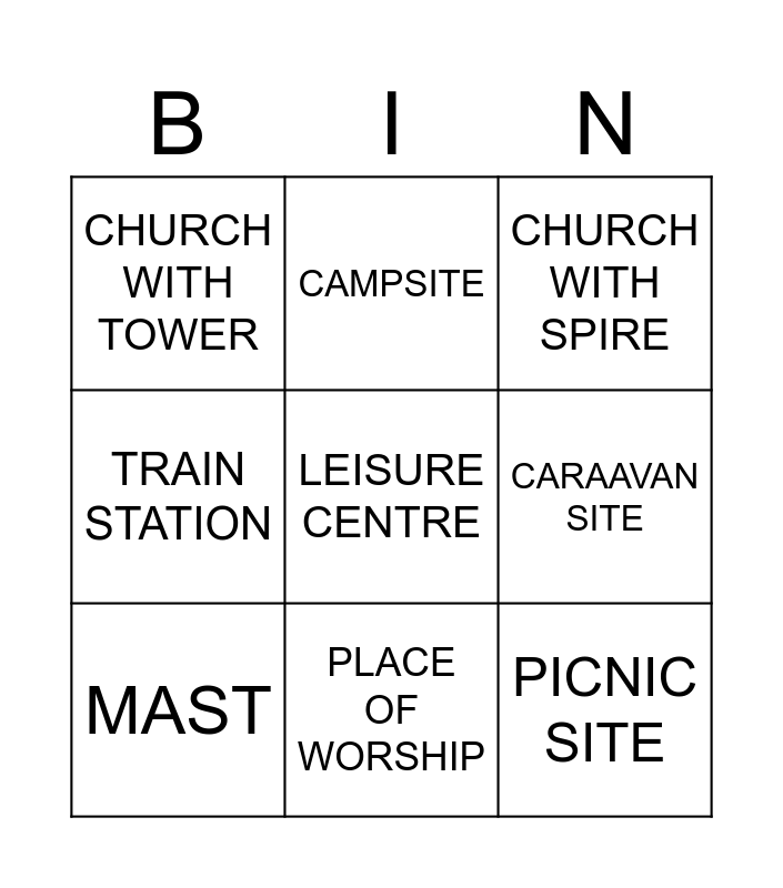 This bingo card has 21 words: Free!, GOLF, CAMPSITE, PHONE, PARKING, MAST, CHURCH WITH TOWER, CHURCH WITH SPIRE, SCHOOL, PLACE OF WORSHIP, PICNIC SITE, TRAIN STATION, WIND PUMP, NATURE RESERVE, CARAAVAN SITE, CAMP AND CARAVAN SITE, VISITOR CENTRE, NATIONAL TRAIL, LEISURE CENTRE, BOAT TRIP and HERITAGE CENTRE.
