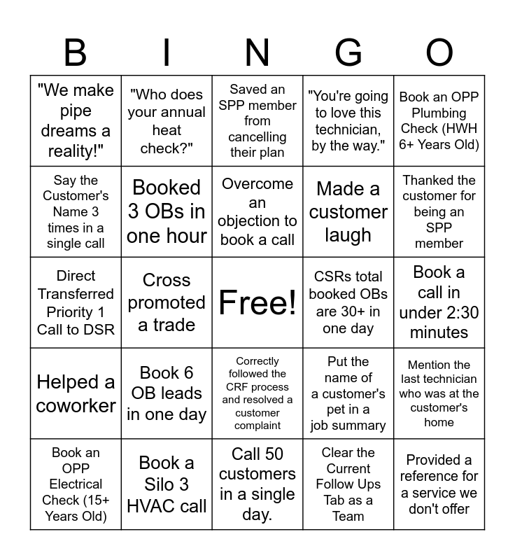 This bingo card has a free space and 24 words: Book 6 OB leads in one day, Book a Silo 3 HVAC call, Overcome an objection to book a call, Book an OPP Electrical Check (15+ Years Old), Book an OPP Plumbing Check (HWH 6+ Years Old), "We make pipe dreams a reality!", Say the Customer's Name 3 times in a single call, "Who does your annual heat check?", CSRs total booked OBs are 30+ in one day, Correctly followed the CRF process and resolved a customer complaint, Made a customer laugh, Direct Transferred Priority 1 Call to DSR, Put the name of a customer's pet in a job summary, Mention the last technician who was at the customer's home, Booked 3 OBs in one hour, Clear the Current Follow Ups Tab as a Team, Book a call in under 2:30 minutes, Saved an SPP member from cancelling their plan, Thanked the customer for being an SPP member, Cross promoted a trade, Provided a reference for a service we don't offer, Helped a coworker, "You're going to love this technician, by the way." and Call 50 customers in a single day..