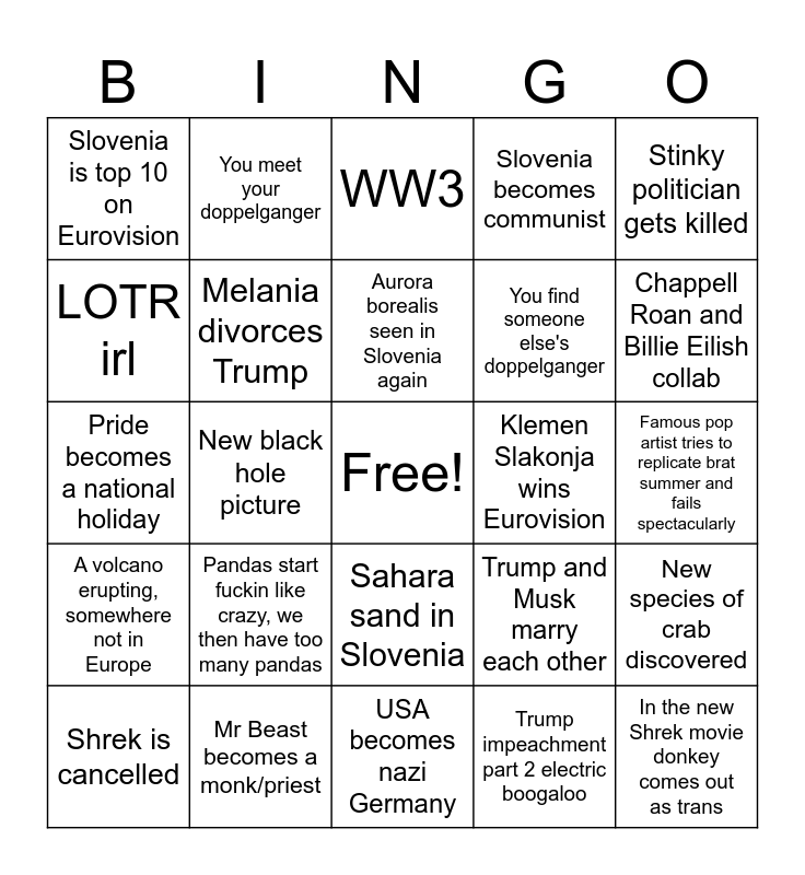 This bingo card has a free space and 31 words: USA becomes nazi Germany, Snow in april/may, New black hole picture, Rain on September 1st, Slovenia is top 10 on Eurovision, WW3, Melania divorces Trump, Trump and Musk marry each other, Klemen Slakonja wins Eurovision, Trump impeachment part 2 electric boogaloo, Famous pop artist tries to replicate brat summer and fails spectacularly, In the new Shrek movie donkey comes out as trans, A swarm of grasshoppers causes the SLO government to shut down for a day, Elon Musk blows up in his own car, Chappell Roan and Billie Eilish collab, Alien life found (and they're just chill guys), New species of crab discovered, Pandas start fuckin like crazy, we then have too many pandas, A volcano erupting, somewhere not in Europe, Sahara sand in Slovenia, Stinky politician gets killed, Someone you personally know breaks a bone, Shrek is cancelled, You meet your doppelganger, You find someone else's doppelganger, LOTR irl, Slovenia becomes communist, Pride becomes a national holiday, Mr Beast becomes a monk/priest, Aurora borealis seen in Slovenia again and Weed becomes fully legal.