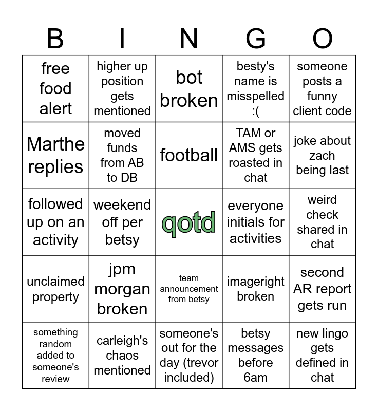 This bingo card has a free space and 34 words: womp womp, betsy messages before 6am, "don't forget to submit time", lynn mentions the haunt, unclaimed property, moved funds from AB to DB, someone posts a funny client code, something random added to someone's review, higher up position gets mentioned, taylor swift mentioned for miranda, football, bot broken, sassy activity comment gets posted, moved funds from DB to AB, everyone initials for activities, joke about zach being last, carleigh's chaos mentioned, followed up on an activity, jpm morgan broken, imageright broken, team announcement from betsy, epic broken, free food alert, weird check shared in chat, someone's out for the day (trevor included), new lingo gets defined in chat, besty's name is misspelled :(, meme gets made, TAM or AMS gets roasted in chat, Marthe replies, 3rd Person Servicer, weekend off per betsy, second AR report gets run and free food per betsy.