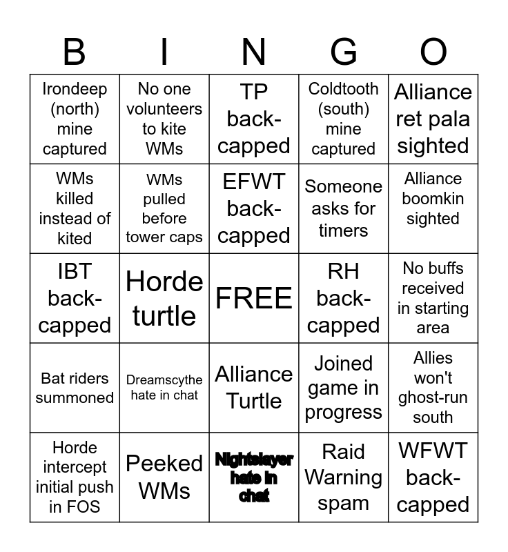 This bingo card has a free space and 24 words: Dreamscythe hate in chat, Peeked WMs, EFWT back-capped, Horde intercept initial push in FOS, Alliance ret pala sighted, Irondeep (north) mine captured, WMs killed instead of kited, No one volunteers to kite WMs, RH back-capped, Alliance Turtle, Someone asks for timers, IBT back-capped, Joined game in progress, Allies won't ghost-run south, WMs pulled before tower caps, Raid Warning spam, No buffs received in starting area, TP back-capped, Alliance boomkin sighted, Horde turtle, WFWT back-capped, Bat riders summoned, Coldtooth (south) mine captured and Nightslayer hate in chat.
