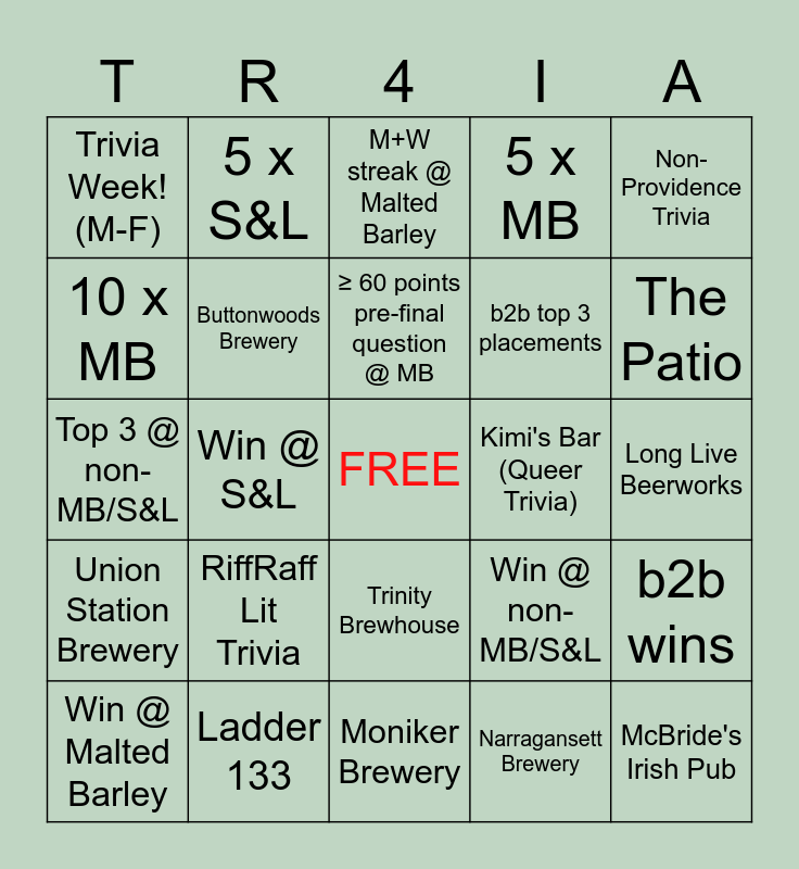 This bingo card has a free space and 29 words: Win @ Malted Barley, Top 3 @ Malted Barley, Win @ S&L, Top 3 @ S&L, Trivia Week! (M-F), M+W streak @ Malted Barley, Buttonwoods Brewery, RiffRaff Lit Trivia, Kimi's Bar (Queer Trivia), Ladder 133, Long Live Beerworks, McBride's Irish Pub, Moniker Brewery, Narragansett Brewery, The Patio, Reiners, Trinity Brewhouse, Union Station Brewery, Non-Providence Trivia, Top 3 @ non-MB/S&L, Win @ non-MB/S&L, Double Team Competition, b2b top 3 placements, 10 x MB, 5 x MB, 5 x S&L, b2b wins, ≥ 60 points pre-final question @ MB and ≥ $50 in winnings.