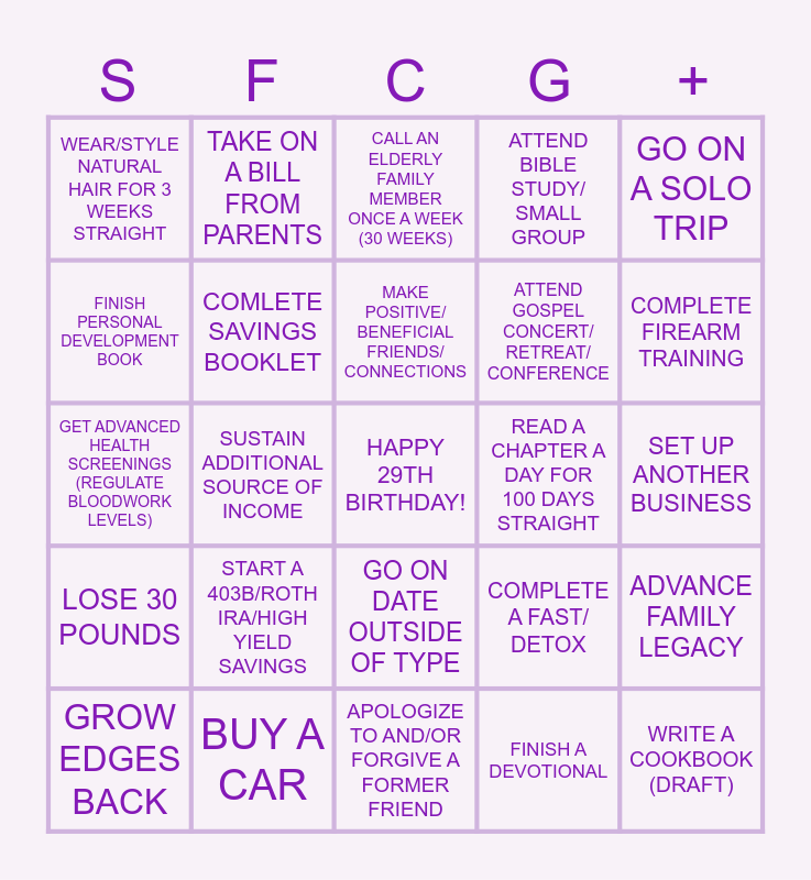 This bingo card has a free space and 24 words: GROW EDGES BACK, START A 403B/ROTH IRA/HIGH YIELD SAVINGS, MAKE POSITIVE/ BENEFICIAL FRIENDS/ CONNECTIONS, FINISH A DEVOTIONAL, GO ON A SOLO TRIP, WEAR/STYLE NATURAL HAIR FOR 3 WEEKS STRAIGHT, TAKE ON A BILL FROM PARENTS, CALL AN ELDERLY FAMILY MEMBER ONCE A WEEK (30 WEEKS), READ A CHAPTER A DAY FOR 100 DAYS STRAIGHT, SET UP ANOTHER BUSINESS, GET ADVANCED HEALTH SCREENINGS (REGULATE BLOODWORK LEVELS), COMLETE SAVINGS BOOKLET, COMPLETE A FAST/ DETOX, ADVANCE FAMILY LEGACY, FINISH PERSONAL DEVELOPMENT BOOK, BUY A CAR, APOLOGIZE TO AND/OR FORGIVE A FORMER FRIEND, ATTEND BIBLE STUDY/ SMALL GROUP, COMPLETE FIREARM TRAINING, LOSE 30 POUNDS, SUSTAIN ADDITIONAL SOURCE OF INCOME, GO ON DATE OUTSIDE OF TYPE, ATTEND GOSPEL CONCERT/ RETREAT/ CONFERENCE and WRITE A COOKBOOK (DRAFT).