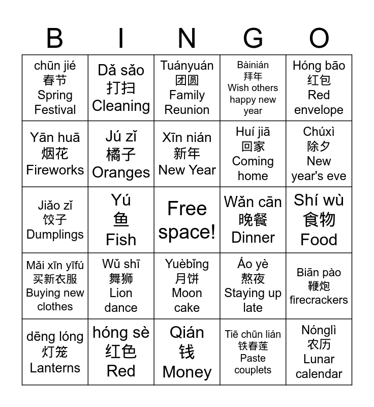 This bingo card has a free space and 24 words: dēng lóng 灯笼 Lanterns, Wǔ shī 舞狮 Lion dance, Xīn nián 新年 New Year, Tiē chūn lián 铁春莲 Paste couplets, Hóng bāo 红包 Red envelope, chūn jié 春节 Spring Festival, Dǎ sǎo 打扫 Cleaning, Tuányuán 团圆 Family Reunion, Wǎn cān 晚餐 Dinner, Shí wù 食物 Food, Jiǎo zǐ 饺子 Dumplings, Jú zǐ 橘子 Oranges, Áo yè 熬夜 Staying up late, Biān pào 鞭炮 firecrackers, Yān huā 烟花 Fireworks, hóng sè 红色 Red, Qián 钱 Money, Bàinián 拜年 Wish others happy new year, Chúxì 除夕 New year's eve, Mǎi xīn yīfú 买新衣服 Buying new clothes, Yú 鱼 Fish, Yuèbǐng 月饼 Moon cake, Huí jiā 回家 Coming home and Nónglì 农历 Lunar calendar.